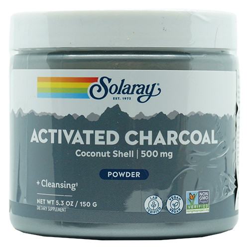 Activated Coconut Charcoal (Solaray) se presenta en un envase con 150 gramos de polvo de carbón activo de coco.