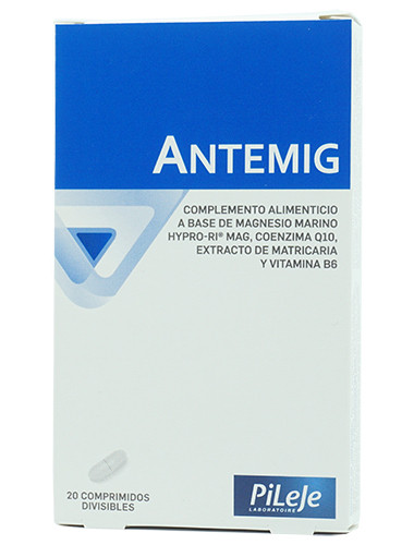 Antemig (Pileje) es un complemento alimenticio a base de Magnesio marino Hypro-ri® mag, Coenzima Q10, extracto de Matricaria y vitamina B6.