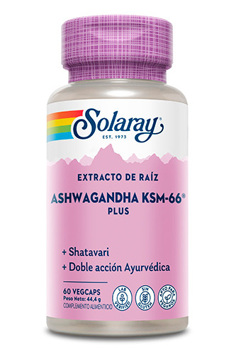 La Ashwagandha KSM-66 (Solaray) es un complemento alimenticio a base de un extracto patentado y de espectro completo de la raíz de ashwagandha (Withania somnifera) conocido por su alta biodisponibilidad y concentración de withanólidos, los compuestos bioactivos de la planta.