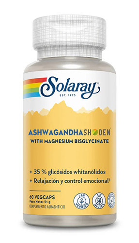 Ashwagandha Shoden® (Solaray) es un complemento alimenticio a a base de un extracto patentado de raíces y hojas de Ashwagandha (Shoden®), junto con bisglicinato de magnesio.