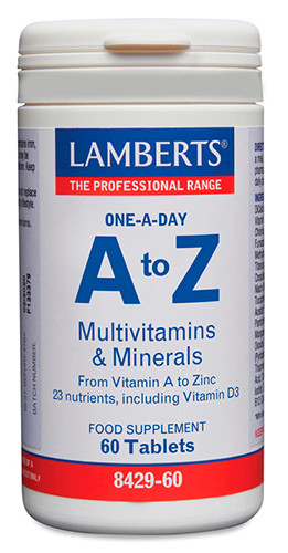 AZ Multi (Lamberts) es un suplemento natural, dentro de la fórmula multivitamínica Uno-al-Día. Contiene todos los micronutrientes principales, varios al 100% de la VRN. En el caso de la vitamina D3 se ha incluido el doble de la VRN, cantidad que se recomienda cada vez más.