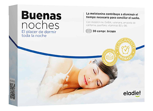 Buenas Noches de Eladiet es un suplemento que reduce el tiempo necesario para conciliar el sueño. Compuesto a base de melatonina, GABA, valeriana, amapola de california y pasiflora.