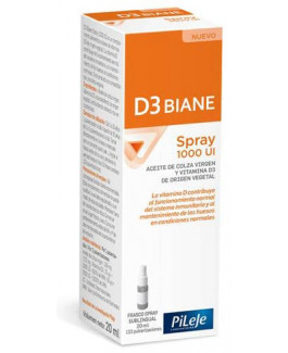 El producto D3 Biane Spray 1000 UI es un suplemento alimenticio a base de vitamina D3 de origen vegetal y de aceite de colza virgen. Aporta una dosificación de 1000 UI de vitamina D3 por pulverización y posibilita una fácil administración.