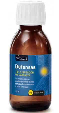 Defensas Tos (Vitalart) es un complemento alimenticio líquido sabor miel y limón, a base de plantas que suaviza la tos y la irritación de garganta.