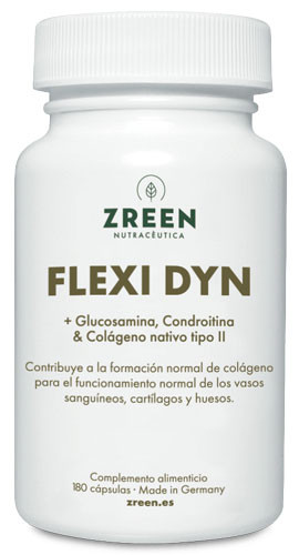 Flexi Dyn (ZREEN) es un complemento alimenticio a base de colágeno hidrolizado, glucosamina, sulfato de condroitina, ácido hialurónico y otros micronutrientes para el mantenimiento y la reconstrucción de huesos, dientes, uñas y tejido conjuntivo.