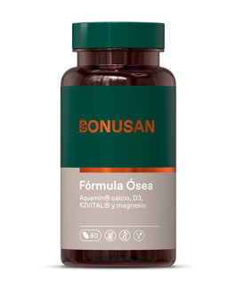 Fórmula Ósea de Bonusan es una fórmula equilibrada con calcio, que es necesario para el mantenimiento de los huesos en condiciones normales, y magnesio y vitaminas D y K, que contribuyen a ello. Fórmula Ósea de Bonusan tiene la proporción óptima entre calcio y magnesio. Para ello utilizamos calcio de una fuente de minerales natural, las algas rojas (Aquamin), y magnesio en una forma de buena absorción, el malato de magnesio. Aquamin, además de aportar calcio bioactivo, contiene magnesio y 72 oligoelementos más.