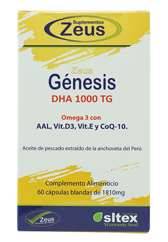 Génesis (Zeus) contienen DHA de máxima pureza en forma de triglicérido y en cápsula roja natural de betacaroteno. Se emplea el triglicérido porque es el mejor transportador del DHA en nuestro organismo y la forma natural de transportar los Omega-3.