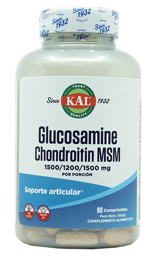 Cada comprimido de Glucosamine-Chondroitin-MSM (Glucosamina-Condroitina-MSM) de Kal contiene 500 mg de Glucosamina, 400 mg de Condroitina y 500 mg de MSM (MetilSulfonilMetano), además de 100 mg de Vitamina C y 27 mg de Calcio.