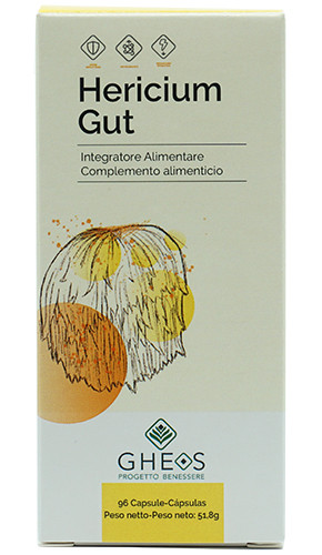 Hericium Gut (Gheos) es un complemento alimenticio a base de hongo Hericum y extractos vegetales, Glutamina, Quercetina, vitaminas y minerales, entre los cuales Biotina y Niacina que contribuyen al mantenimiento del trofismo fisiológico de las mucosas y, junto al ácido Pantoténico, al normal metabolismo energético, Zinc y Selenio que ayudan a proteger las células del estrés oxidativo y, junto al ácido Fólico,ayudan a mantener el funcionamiento del sistema inmunitario.