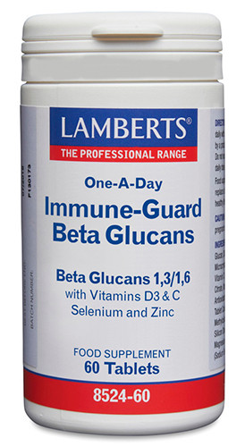 Complejo de Beta Glucanos de Lamberts es un complemento formulado para reforzar el sistema inmunológico, con betaglucanos procedentes de la levadura, vitaminas D3 y C, y minerales como selenio y zinc. Estos ingredientes poseen propiedades relacionadas con la protección al organismo del daño oxidativo y colaboración en el proceso de división celular.