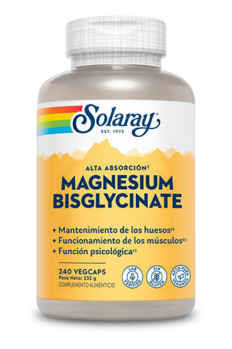 Magnesium Bisglycinate (Solaray) es un complemento alimenticio de magnesio (glicinato), una forma especial de magnesio quelado con el aminoácido glicina.