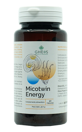 Micotwin Energy (Gheos) es un complemento alimenticio a base de Cordyceps, conocido por sus propiedades tónicas, Reishi o Ganoderma, que ayuda a mantener las defensas naturales del organismo, y Ginseng, tónico-adaptógeno útil especialmente en periodos de mayor estrés psico-físico, combinado con Vitamina C, que contribuye al normal funcionamiento del sistema inmunitario, a reducir el cansancio y la fatiga y a proteger del estrés oxidativo celular.