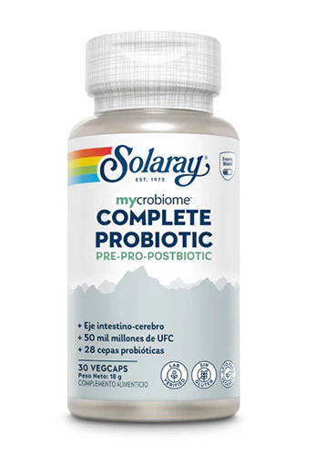 Mycrobiome Complete Probiotic (Pre-Pro-Postbiotic) de Solaray es un complemento alimenticio simbiótico que combina fibras prebióticas (acacia y almidón resistente Solnul®) y 50 mil millones de UFC (Unidades Formadoras de Colonias) procedentes de 28 cepas probióticas y un postbiótico (L. rhamnosus CRL1505 HI).