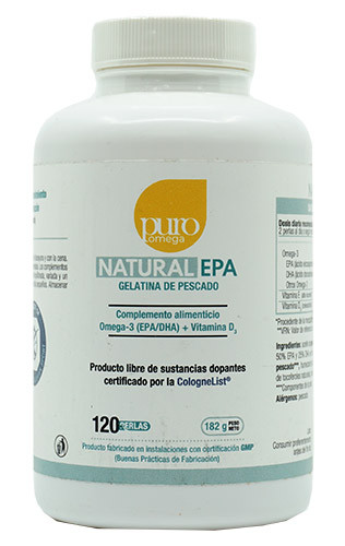Natural EPA (Puro Omega) es un suplemento de Omega-3 (con una alta concentración en EPA) + Vitaminas E y D3.