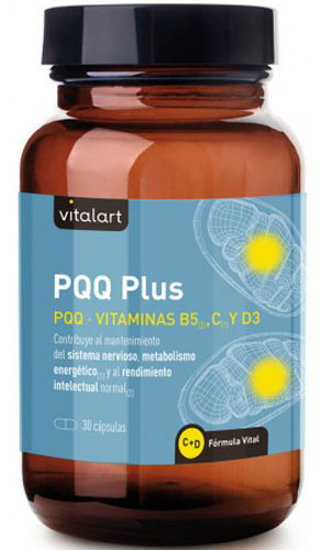 PQQ Plus (Vitalart) es un complemento alimenticio a base de sal disódica de PQQ, con vitaminas B5, C y D3.