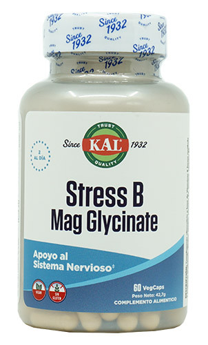 Stress B Mag Glycinate (KAL) se presenta en un envase de 60 cápsulas vegetales.