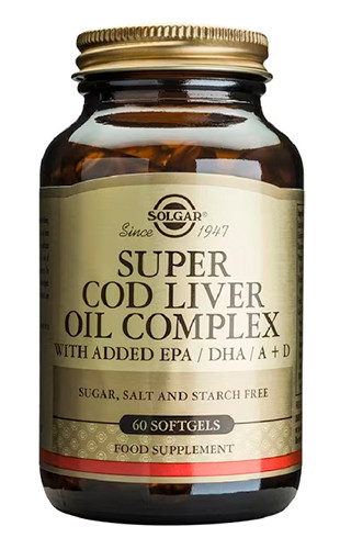 Super Cod Liver Oil Complex (Solgar) es una fórmula alimenticia basada en el Aceite de Hígado de Bacalao, al que se le añade con los ácidos grasos Omega 3 EPA, DHA y Vitaminas del grupo A y D. Super Cod Liver Oil Complex aporta un conjunto de nutrientes en cantidades apreciables, de gran importancia en etapas de desarrollo físico e intelectual y en procesos de alergias o cuando es necesario un refuerzo del sistema inmunitario. Además, ayuda a mejorar la circulación sanguínea y la salud respiratoria.