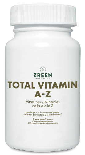 Total Vitamin A-Z (ZREEN) es un complemento alimenticio a base de Vitaminas y Minerales de la A al Zinc. Proporciona un espectro completo de vitaminas bioactivas y minerales ligados orgánicamente en combinación con las sustancias vegetales secundarias luteína y polifenoles.