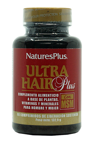 Ultra Hair Plus con MSM (Nature's Plus) se presenta en un envase de 60 comprimidos. Se presenta en forma de comprimidos de liberación sostenida.