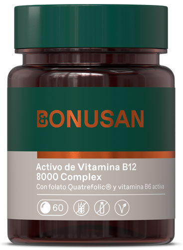 Vitamina B12 activa 8000 Complex (Bonusan) es un complemento alimenticio a base de dos formas activas de la vitamina B12, junto con la forma activa de las vitaminas B6 y el folato, en comprimidos para chupar.