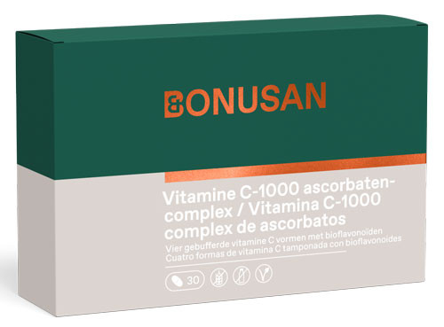 Vitamina C-1000 complejo ascorbatos (Bonusan) es un complemento de vitamina C no ácida que incluye una combinación de ascorbato de magnesio, ascorbato de potasio, ascorbato de calcio y ascorbato de zinc (con pH neutro), por lo que no daña el estómago ni el esmalte de los dientes y se absorbe mejor. No contiene ácido ascórbico, es un vitamina C no ácida, por lo es más suave que las formas convencionales de suplementos de vitamina C. Incluye bioflavonoides cítricos para una mejor absorción y funcionamiento. Es un suplemento de vitamina C con una absorción y efectividad óptimas.