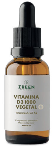 Vitamina D3 1000 Vegetal (ZREEN) es un complemento alimenticio a base de Vitamina D como Colecalciferol vegetal extraído del liquen. que aporta 1000 UI de vitamina D por gota.