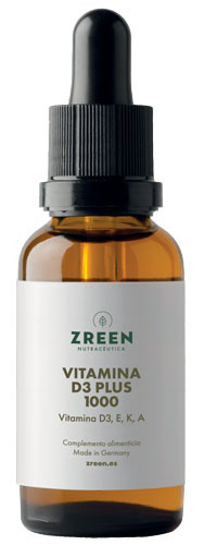 Vitamina D3 Plus 1000 (ZREEN) es un complemento alimenticio a base de las vitaminas liposolubles D3 + K2, E, A.