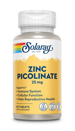 Zinc Picolinate 25 mg (Solaray) es un complemento alimenticio a base de zinc en forma de picolinato de zinc, una de las sales orgánicas con mayor biodisponibilidad en comparación con otras sales inorgánicas (óxido o sulfato de zinc).